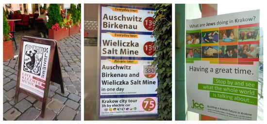 Besides the observations and the interviews, the Jewish-themed commercial and cultural offer displayed and promoted through brochures and websites confirmed the coexistence of different and diverging approaches, but also a relatively low level of conflict, as if these alternative paths, a more staged, simplified, and standardized one, and a more alternative, meditative, and immersive one, were clearly available and recognizable for local as well as international consumers. Figure 2 shows some examples: continuous Jewish-style music performed in Jewish-style restaurants, none of which played or run by Jews; fast excursions to Auschwitz and other Jewish-related sites; self-representation by the Jewish Community Center focusing on present-day social and cultural activities.