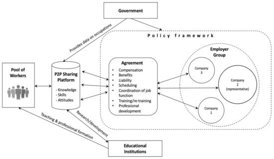 Figure 1 depicts the basic functioning of an ESM. To facilitate the understanding of the ESM framework, we provide the following example in a T&H context. Given a situation of labor market disequilibrium, two employers (e.g., a restaurant chain and a grocery store) voluntarily meet and sign an agreement aimed at facilitating the sharing of service workers (e.g., receptionists, customer service workers). The agreement establishes workers’ compensation, scheduling, liability, coordination of the jobs’ functions, etc. The agreement also specifies the representative/liable company. Then, both employers enroll their pool of service workers in a P2P sharing platform. The service workers can update their knowledge (e.g., knowledge about consumers’ needs), skills (e.g., the use of technical tools), and attitudes (e.g., attentiveness) through the use of the P2P platform. When employers search for employees with specific knowledge, skills, and attitudes (KSA), the P2P sharing platform is capable of matching employers’ needs with workers’ KSA, based on which employees’ sharing can be initiated. Governments can support the matching processes by providing suitable policy frameworks and incentives. Educational institutions can contribute to developing a skilled T&H workforce by creating and updating KSA taxonomies and enriching the functions of the P2P sharing platform.