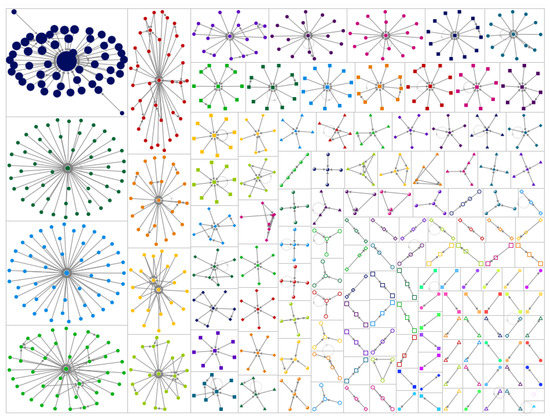 The graph density value ranged between 0 and 1, indicating how connected the vertices were in the network. In this case, the value was low at 0.00089, which means the graph is less dense, with most of the followers not being friends and not connected to one another. Modularity gauges the force of the division of a network into clusters. Networks with high modularity, which is the case here (maximum 1), have dense connections that link the nodes within communities but have sparse connections or edges between nodes in other groups (see Table 1).