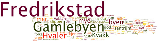 From the word cloud one, can see that many people wrote kvakk (quack) to take part in the Walt Disney contest. People discussed the beautiful photos (vakkert and flott) from Fredrikstad and Hvaler. The restaurant Slippen was also commented on numerous times. Some mentioned Christmas (jul), as this is the time of year to visit Fredrikstad with the lighting of the Christmas tree in the Old Town where the outdoor event is held. One can also notice the other comments in reference to the free ferry (gratis), free shuttle bus (flex), parking difficulties, concerts frequently organized (konserter), and the pleasant people. The word cloud created matches to the “likes” indicated, thereby enabling Facebook to connect visitors with the destination. This provides the tourist authority with a way to potentially reach a wide array of people (see Figure 5).