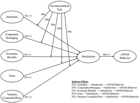 Literature also offers evidence supporting the role of satisfaction as the linking mechanism between several different factors and eWOM behavior. For example, Ha and Im [60] found satisfaction to be a mediator between pleasure and eWOM intention regarding online consumers’ enjoyment of their shopping experience with a web site. Satisfaction was also found to indirectly influence the effects of both information quality and e-service quality of web sites on eWOM when booking homestays in Malaysia [61]. Thus, within the context of the sharing economy and accommodations, a mediating role of customer satisfaction might be logically anticipated. As a result, the following hypotheses are proposed: