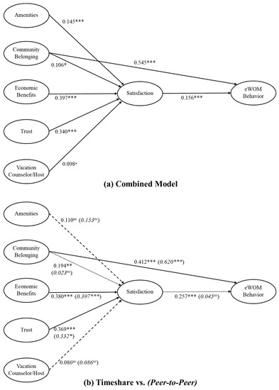 The moderating role of accommodation type (timeshare vs. P2P) was tested via multiple-group analysis, in which structural invariance is used to test whether the parameter estimates across the two groups are statistically significant [64]. The unconstrained path model, which allowed all parameters to vary between the two groups, provided an adequate fit to the data (χ2 = 1775.023 (df = 654, p < 0.001), RMSEA = 0.066, 0.062 ≤ RMSEA CI90 ≤ 0.070, SRMR = 0.069, CFI = 0.931), as did the invariant path model (χ2 = 1797.695 (df = 661, p < 0.001), RMSEA = 0.066, 0.063 ≤ RMSEA CI90 ≤ 0.070, SRMR = 0.073, CFI = 0.930). However, a log-likelihood chi-square difference test indicated constraining the structural parameters to be equal resulted in a statistically significant worsening of overall model fit (Δχ2 = 22.672 Δdf = 7, p = 0.01). In the unconstrained model, group-specific χ2 values revealed the timeshare model provided a better fit to the data (χ2Timeshare = 773.44; χ2P2P = 1001.583).