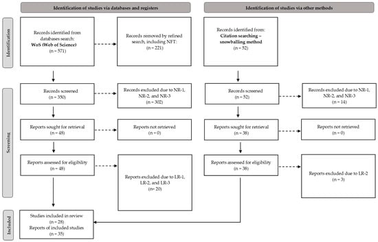 To answer the research question, the systematic review was used to identify all empirical studies according to defined inclusion and exclusion criteria [65]. The snowballing method was applied. Snowballing uses the reference list of a paper to identify additional studies [66]. Preferred reporting items for systematic review and meta-analysis, or PRISMA, was used for a transparent systematization [67,68,69,70]. PRISMA explains how the collection of all viable references for the results was undertaken (Figure 1).