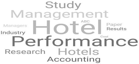 Looking at Figure 2, it is possible to see that the most used word is “hotel”, followed by the word “performance” because it is closely linked to hotel indicators. In third place is the word “management”. Words such as “hotels”, “study”, “accounting”, “research”, “industry”, “paper”, “results”, “managers”, “ABC”, and “cost” also appear in the top ten most frequent words in the abstracts. It should be noted that there are words with the same absolute frequency, so in the top ten, there are 13 words.