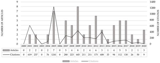 Figure 4 describes the evolution of the number of publications in the period 2000 to 2020. The citations of the publications, which may not correspond to the year of publication of the articles, are also presented in Figure 4.