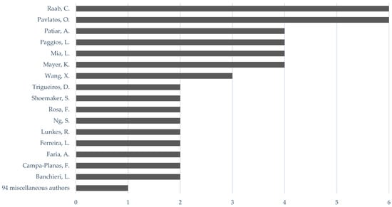 Among the 63 articles included in this study, 143 authors were observed, C. Raab and O. Pavlatos standing out as authors or co-authors of six articles each (Figure 5). There are 94 authors with one published article each.