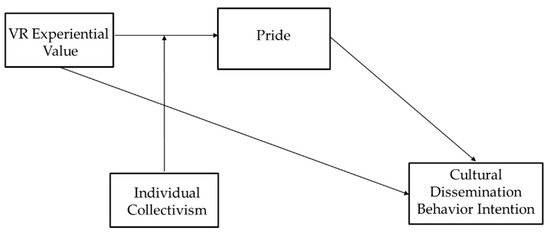 Responding to this research gap, this study builds a moderated mediation model by introducing two constructs, pride and individual collectivism, to explore how virtual reality tourism experiences stimulate tourists’ cultural dissemination behavior intentions. Since virtual tourism has the function of emotional stimulation, and pride is a positive emotion generated by a group’s achievements and is also an important factor for pro-social behaviors, this study views it as a potential relationship quality construct and argues that it can explain the link between virtual reality tourism experiences and tourists’ cultural dissemination behavior intentions. Additionally, the process through which virtual reality tourism experiences promote pride is moderated by the characteristics of the cultural value of tourists. Therefore, this study also considers the cultural value of tourists to explore the boundary conditions of virtual reality tourism experiences that trigger pride. Hence, taking into account the dynamic nature of the abovementioned constructs, we proposed our model (Figure 1), which aimed to explore how virtual reality tour experiential value promotes cultural dissemination behaviors. The current study attempts to extend the understanding of virtual reality tourism experiences from the emotional perspective and apply it to the promotion of cultural dissemination.
