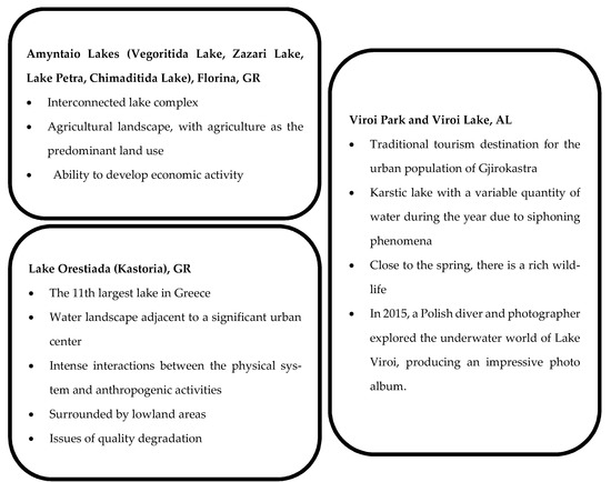 - Greece shares borders with four countries (Albania, Northern Macedonia, Bulgaria, and Turkey). Tourism plays a crucial role in most of the c-b areas, while geopolitical tensions and events affect the tourism industry, e.g., the refugee crisis on the islands of Lesvos and Chios [43]. Destinations close to the Greek–Albanian border, Ioannina and Kastoria, are typical destinations with a particular attractiveness factor: their waterfront on the lake. Ioannina is a city that mainly attracts domestic tourists. At the same time, Kastoria in Western Macedonia is a typical example of a city that is very much affected by car tourism and unexpected events, e.g., the closing of the borders due to COVID-19 restrictions have a substantial effect on tourism flows [44,45]. In the case of the cross-border area of Greece and Albania, the first steps for common activities in the tourism sector are still to be made. Thus, it is an opportunity to compare the Greece–Albania border area to other European border areas with similar geophysical characteristics. The area’s current, somewhat undermined image is incompatible with its essential qualities and potential. These are areas of high natural value and various tangible and intangible heritage assets, which are underestimated and are not recognized as key attractions.