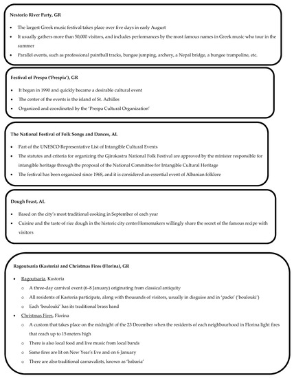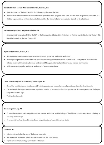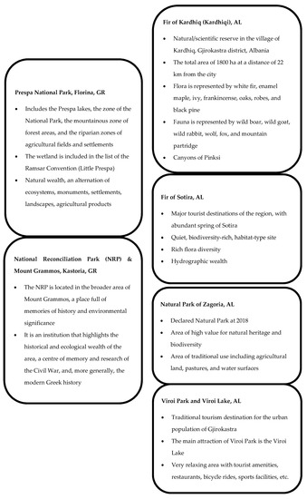 The results of the critical evaluation of the resources showed that the cross-border Greek–Albanian area has a rich reserve of natural, tangible, and intangible eco-cultural resources, presenting significant biodiversity of natural ecosystems. Unique historical, archaeological, and cultural diversity characteristics can form place brands through appropriate strategic planning and branding efforts.