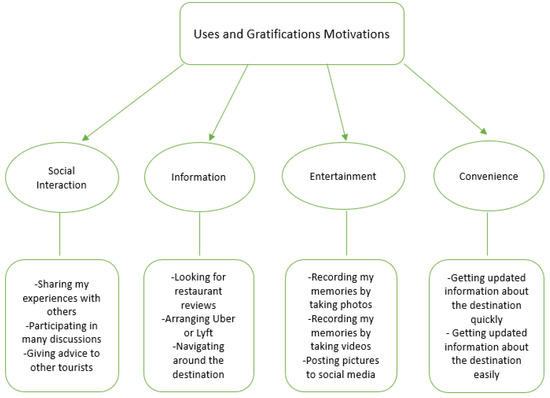 Previous studies have discovered multiple dimensions explaining the reasons for media use, and this study employs the four constructs of information (convenience, social interaction, and entertainment) based on past advertising and journalism studies since those are most applicable to smartphone research in the context of tourism [6,7,8,43,44,45,46,47] (Figure 1).