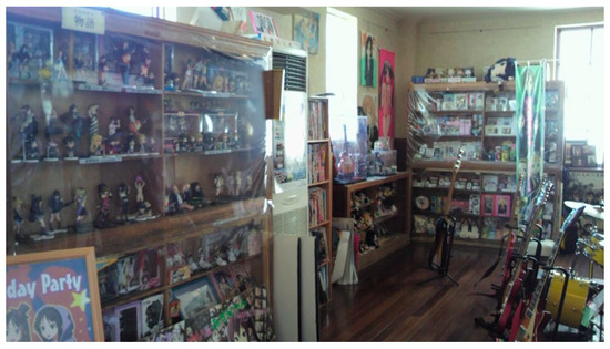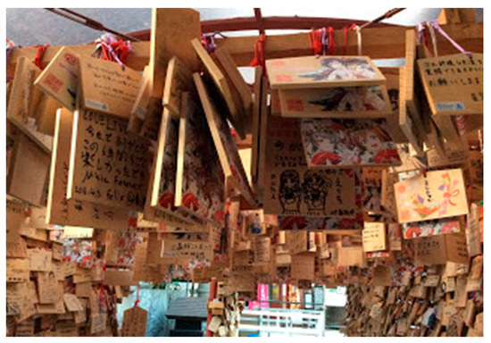The on-site behavior of purposeful anime tourists often goes beyond the activities of ordinary mainstream tourists and even film-induced tourists. Of the arguments raised by Okamoto [5], this study finds the following most interesting. The first activity is tourists leaving a trace of their visit at their destinations. A typical behavior engaged in is dedicating Ema to shrines where an anime was set. An Ema, or votive tablet, is a wooden board offered to shrines on which one can write their wishes. Purposeful tourists describe characters or messages on their tablets and hang them in shrines (Figure 1). Additionally, it is interesting to leave anime-related goods at places that have appeared on-screen. Figure 2 illustrates the many goods left by anime tourists. A second type of activity is these tourists publishing information about the sites featured in anime on websites as well as photographs of these locations. These tourists aim to share their knowledge about the destinations and each site featured with fan communities. The third activity of these tourists is cosplaying and driving itasha, cars decorated with an anime character’s picture. Not all purposeful visitors engage in both or even either of these activities, but some fan tourists prefer doing so to show their deep affection for the anime [42]. The fourth point is that these tourists interact with the host community as well as with other fan tourists. According to Okamoto [5], it is common for purposeful anime tourists to converse with locals at their destinations. The more regularly fans visit the filmed place, the more likely they have an exchange with the host communities [43].