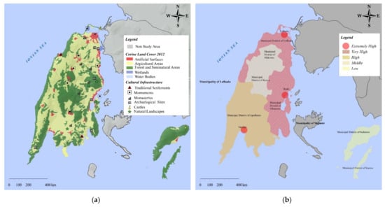 Maps depicting: (a) land uses and cultural infrastructure in the study area and (b) levels of tourism concentration based on hotel accommodation and tourist attractions.