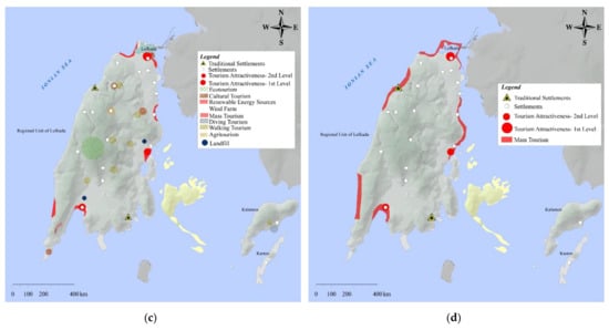 This scenario represents the current state of tourism in the study area. It focuses on the maintenance of the model of mass tourism development, and it is based on the existing dynamics (trends) of the tourism sector (Figure 4c). The tourist destinations of the island follow a specific route, which has been economically successful so far. The development of tourism demonstrates a specific spatial structure that can be found in the eastern part of the study area, along the coastal settlements. The model of mass tourism development, combined with the high concentration of visitors in the city of Lefkada or other tourist attractions, leads to the gradual degradation of the study area. Finally, the current model of tourism development on the island has already shown some negative impact, as emphasis is placed on the emergence of the place as a tourist destination, mainly mass tourism, and on the promotion of the reckless use of local resources, high seasonality of the tourist product and attracting low-impact tourist flows.