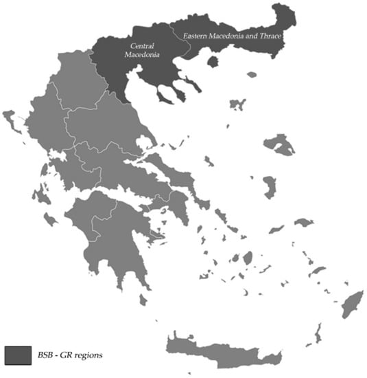 The Greek part of the cross-border Black Basin region consists of two administrative regions, the regions of Central Macedonia, and Eastern Macedonia and Thrace (from now on, BSB-GR). The BSB-GR regions cover an entire area of 33,352 km2 in the north of the country (Figure 1), with a total population of 2.5 million people, accounting for 23% of the national population. The Region of Central Macedonia is the second-largest region in Greece, after Attica, with a population of 1,882,108 people, accounting for 17% of the entire Greek population, 58.7% of which live in the Regional Unit of Thessaloniki. To a large extent, it is an urban region, with the city of Thessaloniki, the second largest metropolitan area in the country, being its main urban centre. The region of Eastern Macedonia and Thrace is one of the smallest regions in Greece, with a population of 608,182 people, or 5.6% of the country’s total population.