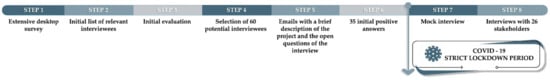 At an initial stage, we performed an extensive desktop survey, aiming to identify relevant stakeholders as follows: (a) stakeholders both of the private or the public sector who were involved in the wider field of alternative forms of tourism and in various sub-sectors (accommodation, restaurants, tour agencies, government, public organizations, destination management organizations, educational institutions); (b) stakeholders, mainly of the public sector, who are involved in policy making at the local, regional, and national levels. An initial list of relevant interviewees was completed (Table 1), representing all the categories of stakeholders that were identified by the PRO EXTOUR project. This list, which was practically open, eventually included 124 stakeholders. After an initial evaluation with the help of our theoretical framework, we selected 60 potential interviewees who seemed to be more closely involved with experiential activities in the field of culture and heritage. This initial evaluation concerned primarily tourism enterprises, from both the private and public sectors. For these enterprises, we checked whether the description they provided for their products/services seemed to meet at least some of the features described in our conceptual framework. For a better preparation of the informants, and in order to select the ones who were oriented towards experiential tourism tasks the most, i.e., their products/services met at least some of the important features described in the conceptual framework, emails were sent including a brief description of the project and the open questions that would be used during the interview. It should be noted here that certain stakeholders of the public or corporate sector, such as the Ministry of Tourism, the Greek National Tourism Organization, the Greek Tourism Confederation, the Hellenic Hoteliers Federation, and the two regional administrations were chosen in an ad hoc manner, as they play a crucial role in the tourism sector at both the national and regional level. On the whole, we received 35 initial positive answers. It is worth noting that the entire survey period coincided with the most severe lockdown of the COVID-19 pandemic period held in Greece. Therefore, this was a period of uncertainty for many of the private companies that were contacted, as they either were shut down or very reluctant to take part in the survey. This situation led to an extension of the interview phase. Finally, 26 stakeholders participated in the in-depth interviews, according to their relevance and their availability to participate.
