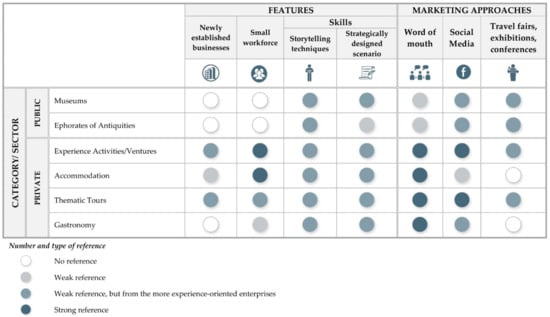 The overall desktop research that took place as a first step of our qualitative survey showed that, despite the growing attention to experiential tourism internationally, only a small number of enterprises related to tourism have actually developed experiential activities in both BSB-GR regions. Figure 4 summarizes the main features and marketing approaches of the tourism enterprises per category and sector of activity, as drawn from the 16 interviews with stakeholders from experiential tourism enterprises. The categories we used for both the enterprise features and marketing approaches resulted from the thematic analysis of the in-depth interviews. It should be noted that one of the aims of the qualitative survey was to investigate, with general questions, the features of experiential tourism enterprises, especially their size, year of establishment, special skills of the workforce, and the marketing approaches they follow. The similarities between the answers of the interviewees, and their correlation to the conceptual framework, resulted in the categories used below, in Figure 4.