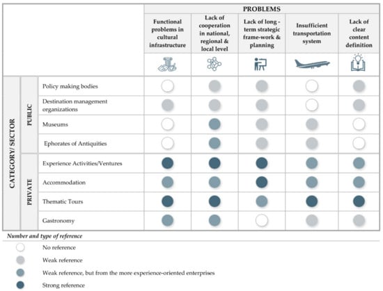 Among the main problems raised by the interviewed stakeholders are the multiple functional problems of many cultural sites, such as poor maintenance, lack of cooperation within and between all governance scales (national, regional, and local), and insufficient strategic planning, along with a lack of content definition. Such problems often result in deficits in obvious prerequisites of the tourism product: the stakeholders pointed out, for example, that many of the main archaeological and historical monuments, and especially those in distant areas, are often closed on days with higher numbers of travellers, such as weekends.