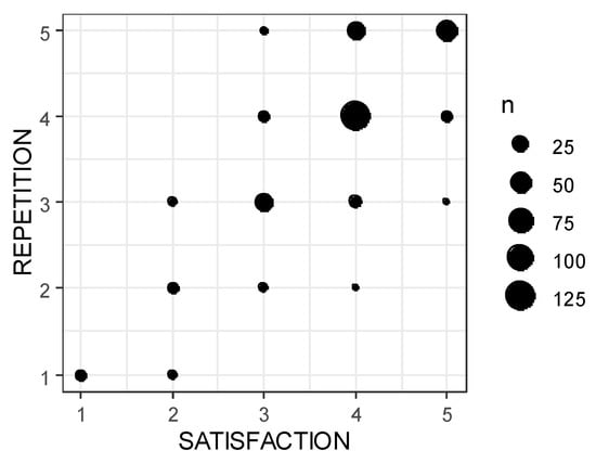 Figure 1 depicts a scatterplot of the responses obtained for these two variables in the survey, suggesting the existence of a positive relationship. The strength of this association was also evaluated by computing the polychoric correlation coefficient between the variables. The coefficient was shown to be of 0.7931. This value is quite high, which indicates that there is a strong positive association of around 80% between the likelihood of repeating the visit and previous overall level of satisfaction of customers with the anti-covid measures applied. In fact, it appears that higher levels of satisfaction relate to higher intention to return.