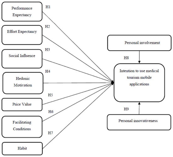 Hence, this study augments the application of the UTAUT2 and adds two individual factors (i.e., personal involvement and personal innovativeness) to explain users’ intentions regarding medical tourism mobile applications. Therefore, the primary purpose of this study was to combine the UTAUT2 and the two specific factors to improve the IT adoption model and better explain users’ intentions with respect to medical tourism mobile applications.