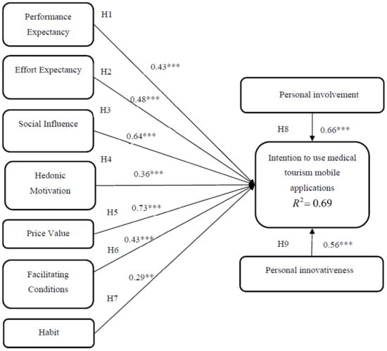 All UTAUT2 constructs were fit to the setting of medical tourism mobile app usage. This study can confirm the importance of the UTAUT2 constructs in the setting of medical tourism mobile app usage as has been demonstrated in [] in the e-commerce context. As for the other main predictors of users’ intentions to use medical tourism mobile apps, both personal involvement () and personal innovativeness () were proven to have a significant influence on users’ intentions to use medical tourism mobile apps, confirming H8 and H9.