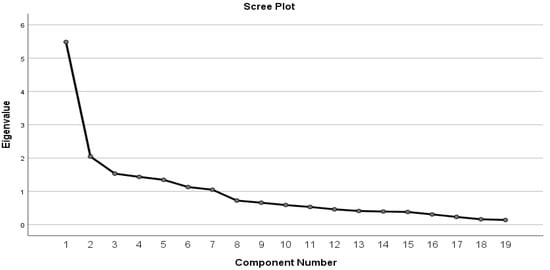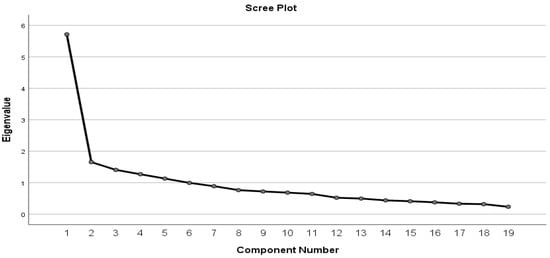 Exploratory Factor Analysis for sample 1 and sample 2 performed to look at Bartlett’s Test and Measurement of Sampling Adequacy. It is clear from Snedecor and Cochran (1989) [] that non-normality would be shown if the sample originated from a non-normal distribution. As seen in Table 6, the test confirmed that factor analysis would indeed be applicable as the significance was below 0.05. Figure 1 and Figure 2 provide the scree plots for the Sedibeng and Fezile Dabi district municipalities.