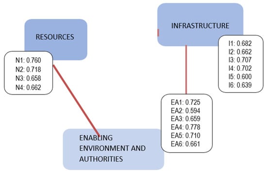To test for convergent validity, the AVE (Average Variance Extracted) value was used. AVE should be above 0.5 or more, and the CR 0.7 or more. CR (Composite Reliability) should be higher than the AVE (Götz, Liehr-Gobbers & Krafft 2010) []. However, as emphasised by Fornell and Larcker (1981) [], even if AVE is less than 0.5, but composite reliability is higher than 0.6, the convergent validity of the construct is still adequate. As seen in Table 8, the obtained AVE values for infrastructure and authorities and enabling environment in sample 1 constructs were 0.430 and 0.473 and for sample 2 resources (0.457), infrastructure (0.393) and enabling environment and authority (0.415) respectively. When taken together with the values of CR, they were higher than 0.6 for each construct in samples 1 and 2, and it can be stated that convergent validity was established.