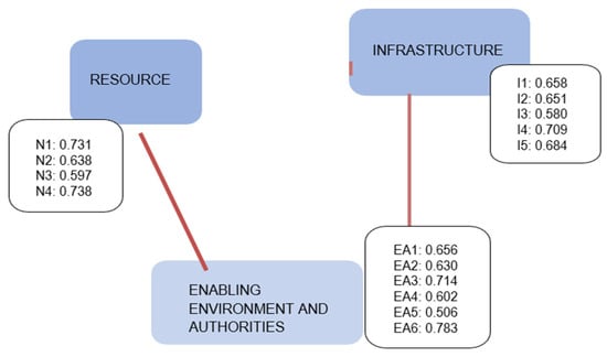 In Table 6 for sample 1, the KMO of O.747 for resources, a KMO of 0.757 for infrastructure and a KMO of 0.839 for enabling environment and authorities was obtained. In Table 6 for sample 2, a KMO of 0.752 for Resources, a KMO of 0.750 for infrastructure, and a KMO of 0.769 for Enabling Environment as indicated by Hair et al. (2010) [] indicating that factor analysis would be appropriate.