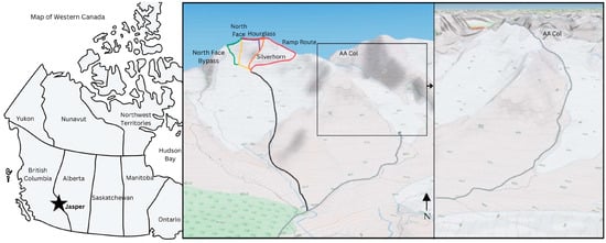 This study focused on the implications of climate change for mountaineering and guiding activities on Mt. Athabasca (3491 m a.s.l., 52.1800° N, 117.1950° W) in Jasper National Park (Alberta) of the Canadian Rockies. Located on the eastern edge of the Columbia Icefield, Mt. Athabasca was first climbed in 1898 by Norman Collie and Herman Woolley. This feat, enabled in part due to the completion of the Canadian Pacific Railway (1885), brought thousands of visitors, including mountaineers, to the Canadian Rockies for the first time [34]. To these early mountaineers, western Canada represented boundless opportunity and the subsequent influx of climbers saw the establishment of many new mountaineering routes in the area. However, in the late 19th century, access north towards the icefields and Mt. Athabasca was still a considerable challenge. This changed in the early 1940′s when the ‘Wonder Trail’, a 230 km path linking Lake Louise (south) to Jasper (north), was transformed into a single lane road known as the Icefields Highway [35]. Access was further improved in 1961 with the completion of the Icefields Parkway (ibid.), a two-lane highway that provides unparalleled access to mountains along the spine of the southern Canadian Rockies, including Mt. Athabasca. Today, Mt. Athabasca is one of the most summitted 11, 000-foot peaks in the range and is considered to be ‘the bread and butter’ of Canadian Rockies mountain guiding. Herein, we focus on the peak’s main climbing routes, including the Ramp, Silverhorn, North Face, North Face Bypass, Hourglass, and Athabasca–Andromeda (AA) Col (Figure 1).