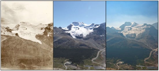 Triptych of historical and repeat images for Mt. Athabasca in Jasper National Park. The historical image (left) was captured by A.O. Wheeler as part of the Interprovincial Boundary Survey in 1918. The second image (centre) was captured by MLP researchers in August 2011. The third image (right) was captured by Katherine Hanly and James Tricker in August 2023. Historical image courtesy of Library and Archives Canada. Repeat images courtesy of the Mountain Legacy Project, University of Victoria. All images are available at https://explore.mountainlegacy.ca/ (accessed on 16 July 2023).