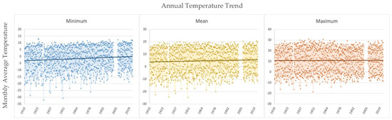 Annual trends in minimum, mean, and maximum temperature based on monthly averages from 1 January 1912 to 31 December 2022.