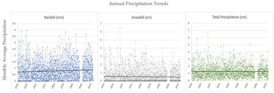 Statistically significant increases in rainfall (0.002 mm/year) and total precipitation (0.002 mm/year) and a non-significant decrease in snowfall were observed between 1910 and 2022 (Figure 3). During winter months, a statistically significant increase in rainfall and decrease in total precipitation were detected. Trends regarding snowfall were less clear; however, the simultaneous increase in rainfall and decrease in total precipitation suggests winter snowfall is decreasing. Statistically significant increases in rainfall were observed in spring, summer, and fall months (very small magnitudes) and total precipitation in spring and summer. Snowfall trends remained unclear during these months.