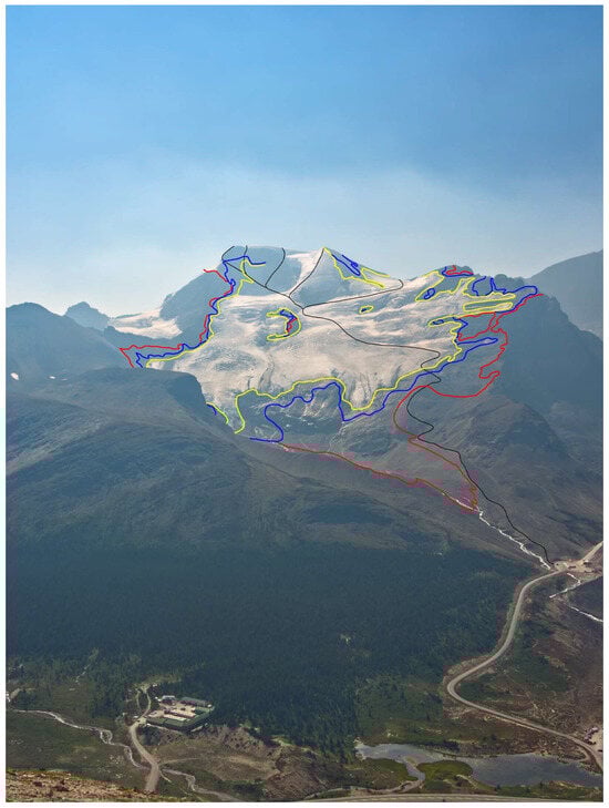 The quality of the new repeat image captured in 2023 was affected by smoke from nearby wildfires and poor lighting on the steeper sections of Mt. Athabasca. We edited this image in Affinity Photo to improve clarity and increase shadow lighting. All three images were aligned using the Image Analysis Toolkit developed by MLP researchers [53] and uploaded to the MLP Explorer website (https://explore.mountainlegacy.ca/stations/show/1096, (accessed on 16 July 2023)). We analyzed the historical and two repeat images in Affinity Photo by delineating the extent of the glacier for the three images. These extents were then overlayed onto the new repeat image, along with the climbing routes, as described in the study area section.