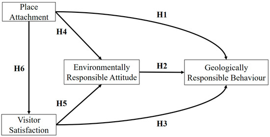 This paper assesses the relationships between different factors that may affect geologically responsible behaviour using structural equation modelling (SEM). The relationships between geopark visitors’ place attachment (PA), satisfaction (SA), environmentally responsible attitudes (ERA), and geologically responsible behaviours (GRB) are explored. The term geologically responsible behaviour has been used in this paper to truly reflect the conservation behaviours towards the geological features of the geoparks observed. According to our literature review, the six core hypotheses were developed as follows: