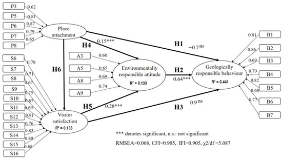 AMOS 21 was then used to carry out a confirmatory factor analysis to test the rationality of the scale composition fitness index. Path analysis was carried out. Finally, structural equation modelling of the Chinese geopark visitors’ geologically responsible behaviour was performed to explore the causal relationships between the constructs.