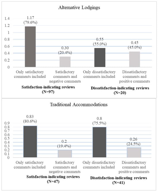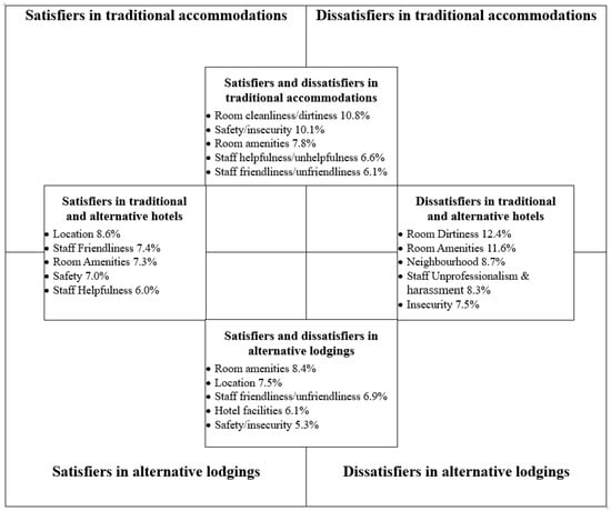 In alternative lodgings (Figure 1), 79.6% of the 97 satisfaction-indicating reviews were entirely positive, while 20.4% were mixed. Of the 20 dissatisfaction-indicating reviews, 55% were solely negative, with the remaining 45% containing some positive input within predominantly negative feedback. In traditional accommodations, among the 47 satisfaction-indicating reviews, 80.6% were purely positive and 19.4% mixed. Additionally, we analyzed 41 dissatisfaction-indicating reviews, with 75.5% being entirely negative and 24.5% mixed, to identify key dissatisfiers.