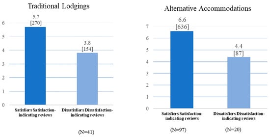 We calculated the average count of satisfiers and dissatisfiers within satisfaction- and dissatisfaction-indicating reviews for both lodging types (see Figure 3). In traditional accommodations, the averages were 5.7 satisfiers and 3.8 dissatisfiers. For alternative lodgings, the averages were 6.6 satisfiers and 4.4 dissatisfiers per review. Our analysis reveals a higher average frequency of satisfiers and dissatisfiers in alternative lodgings compared to traditional accommodations. This could potentially be attributed to the diverse range of accommodation options that fall under the banner of ‘alternative lodgings’. Such variety may lead to a wider spectrum of guest experiences and, consequently, an increased number of determinants for satisfaction or dissatisfaction. Furthermore, the less-standardized nature of these accommodations, in contrast to their traditional counterparts, might mean that guests have less consensus on what constitutes a standard experience, leading to a broader range of satisfiers and dissatisfiers. In conclusion, it appears that the task of satisfying guests is more challenging for alternative lodgings. However, these accommodations also seem to provide a richer array of satisfactory experiences, as indicated by the higher number of satisfiers identified in their reviews.