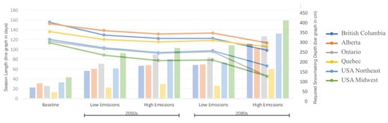 Because Western Canada is a national and international ski destination, it is important to compare the projected impacts of climate change in this regional market with others across North America and internationally. Figure 1 provides a comparison of the projected impacts of common climate change scenarios (RCP 4.5-low emissions and 8.5-high emissions) on multiple North American regional ski markets assessed with the SkiSim model. Other studies that use different methodologies and that have been found to not model observed seasons as accurately as SkiSim (see comparisons in [,]) are not included in this comparison. Western Canada’s 155-day current average season length is 14%, 34%, 29% and 37% longer, respectively, than Quebec, Ontario, and the United States northeast and mid-west regional baseline seasons (Figure 1). Across Canada, baseline snowmaking requirements are the lowest in Quebec (31 cm), followed by BC (55 cm), Ontario (63 cm) and AB with the largest current average use of snowmaking (76 cm) (Figure 1). The United States ski regions have greater baseline snowmaking requirements than their more northern competitors in Canada, with the Northeast requiring an average of 81 cm and the Midwest requiring 107 cm.