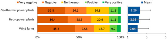 Five years later, the same questions were again submitted to travel agencies and day tour providers operating in Iceland [31]. Tourism service providers’ attitudes towards the development of different types of REI seemed to have changed over the five-year period between the two surveys. In the latter study by Tverijonaite, Sæþórsdóttir, Ólafsdóttir, and Hall [31], the respondents were most strongly negative towards wind farm constructions in the highlands, with 68% viewing them as negative. Similarly, 65% of the respondents had a negative view of hydropower developments in the highlands and 59% opposed geothermal power plants in the highlands. In contrast, respondents were significantly less negative towards REI developments in the lowlands of Iceland. Still, the highest proportion of respondents (45%) were negative towards wind farms, followed by hydropower plants (40%). On the other hand, 37% of respondents had positive attitudes towards the further development of geothermal power plants in the lowlands, while only 32% had negative attitudes. Furthermore, the environmental attitudes of respondents were shown to be negatively related to their attitudes towards most REI developments, with the exception of wind farm developments in the lowlands [31].