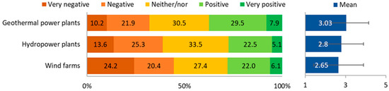 In line with previous research [9,10], this study showed that tourism service providers in Iceland tend to be rather negative towards future power plant developments since they degrade the natural environment and the quality of natural attractions, which are the main products they market. However, this study revealed that tourism service providers in Iceland are less opposed to geothermal energy developments compared to hydropower and are the most negative towards onshore wind energy infrastructure developments. Moreover, attitudes towards REI are influenced by the locational settings. In this study, respondents were significantly more negative towards the development of all types of REI in the highlands compared to the more developed lowlands. In Iceland’s highlands, which are characterized by natural and wilderness landscapes, 58.9% of respondents were negative towards the construction of geothermal power plants. On the other hand, the further construction of geothermal power plants in the lowlands was viewed negatively by 32.1% of respondents, while a higher proportion, or 37.4%, perceived such developments as positive. Such findings suggest that consideration of the type of REI together with other factors, such as locational aspects, is likely to help identify energy projects that would be the most compatible with tourism.