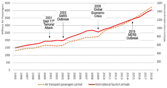 As for the 21st century, in a span of just fifteen years, from 2000 to 2015, major disruptive events took place, such as the terrorist attack of 9/11, SARS and its outbreak in 2003, the global financial crisis in 2009, the Ebola virus in 2014 and MERS in 2015 [13]. Figure 1 presents how crisis events affect international tourism arrivals.