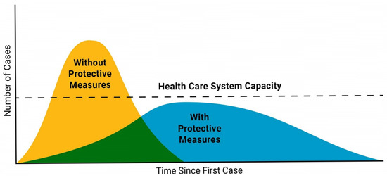 The World Health Organization [17] defines herd immunity, also known as population immunity, as the indirect protection against an infectious disease that occurs when a population acquires immunity either through vaccination or immunity developed through previous infection. During the outbreak of COVID-19 and before the vaccination, the medical community and the public health sector had only non-pharmaceutical interventions against COVID-19. Their ultimate goal was to mitigate the pandemic using these tools. The specific category of measures, non-pharmacological interventions (NPIs), were aimed at suppressing the peaks of the COVID-19-outbreak waves, smoothing the curve and delaying the resurgence of the virus. In this way, the smooth operation of the public health system of each country was ensured, as well as the reduction of morbidity and mortality caused by COVID-19 (Figure 2).