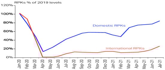Even specifically, regarding tourism industry indicators during COVID-19, according to the IATA [29], the COVID-19 pandemic has led to the biggest shock to the air travel and the airline industry since World War II. COVID-19 had a direct effect on air transport. The negative impact the pandemic has had on the aviation industry for 2020 is a dramatic 66% decrease, measured in passenger kilometers (RPKs), compared to 2019 [30] (Figure 4).