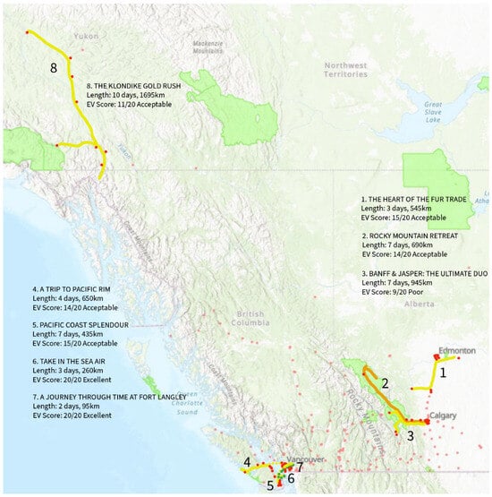 Multi-day national park routes mapped (green line indicates excellent, yellow line = acceptable, orange = poor) across Western and Northern Canada relative to Level 3 chargers (indicated by red dots).