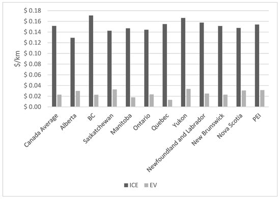 Cost: ICE trip cost was calculated based on the overall trip distance (km) for each itinerary times the cost of fuel per km ($/km) at the average provincial level during June 2022 [42]. EV trip cost was calculated based on the overall trip distance (km) for each itinerary times the number of kWh required to complete the route, based off the average EV efficiency of 0.18 kW/km, and priced at the provincial electricity cost per kWh [43]. It should be noted that costs of charging vary from free to $25/h at different public charging facilities, with vehicles themselves having varying charging speeds and capacities which also affect the price of charging.