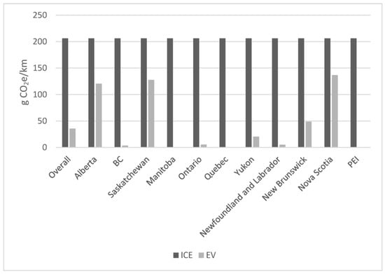 Some of these same regions, including Nunavut, Saskatchewan, Nova Scotia, and Alberta, have high-carbon-intensive electricity grids, meaning electric vehicles emit over 120 g of CO2e per kilometre, on average [44]. While this is still less than the 206 g of CO2e emitted by an ICE vehicle [6], the reliance on high carbon grids may lead to similar critiques to those found in Indonesia on the impact of electric vehicle transitions in an eco-tourism destination if the key power source continues to be coal-fired power stations [34]. Linking the EV transition to the decarbonization of electricity grids is therefore essential to truly decarbonize drive transport and travel. A case study of Florida, USA-based initiatives are an example of linking transportation sector policy—“Drive Electric Orlando”—with destination-wide sustainability goals and energy security concerns—“Green Destination Orlando” [37]. Waiting for the grid-wide transition to renewables to invest in EV infrastructure will leave these provinces behind on the EV transition. As these provinces decarbonize their electricity sources, emissions for EV-based travel will drop even faster, wherein linking the decarbonization of electricity could be done in conjunction so that EV usage and infrastructure contribute to small reductions in the short term, and when grids decarbonize, transportation sectors’ emissions will simultaneously drop significantly.