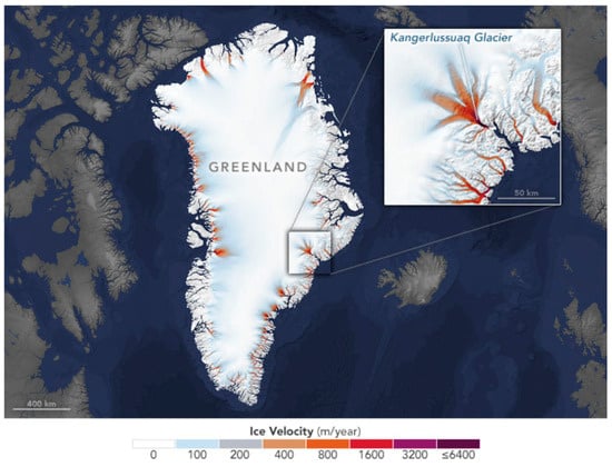Decline of the Greenland Ice Sheet as revealed by the glacier outflow data spanning 1985–2015. Increased velocity implies progressive mass loss. The Kangerlussuaq Glacier is highlighted inset. Image courtesy NASA Earth Observatory, from: https://earthobservatory.nasa.gov/images/147728/shrinking-margins-of-greenland. (accessed on 20 March 2024).