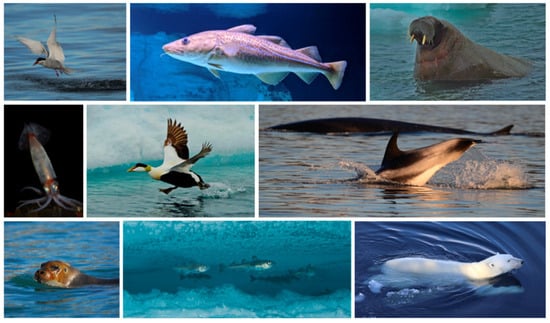 Some notable examples of Arctic marine megafauna. Top (left to right): Arctic Tern, Atlantic Cod, Walrus. Center (left to right): Boreo-Atlantic Armhook Squid, Common Eider, White-beaked dolphin. Bottom (left to right): Bearded seal, Polar cod, Polar bear. Reprinted from Trends Ecol. Evol. Grémillet, D.; Descamps, S. Ecological impacts of climate change on Arctic marine megafauna. 38(8) 773–783. 2023 [79], with permission from Elsevier.