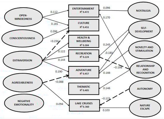 The model includes standardised beta coefficients, which assess the relative impact of each independent variable on the dependent variable [79]. Open-mindedness, (β = 0.181, p = 0.000) indicates a positive relationship with culture (β = 0.181, p = 0.000) and entertainment (β = 0.112, p = 0.000). Visitors with higher levels of open-mindedness exhibit a stronger inclination towards engaging in cultural activities, followed by entertainment. Conscientiousness revealed a positive relationship with cultural activities (β = 0.096, p = 0.000). Extraversion revealed a positive relationship with adventure (β = 0.190, p = 0.000), recreation (β = 0.144, p = 0.000), and health and wellbeing (β = 0.122, p = 0.000), but also a negative relationship with culture (β = −0.156, p = 0.000). Interestingly, the data showed that when the level of extraversion increases, there is a decrease in interest towards cultural activities. Agreeableness revealed a positive relationship with lake cruises (β = 0.094, p = 0.000) and a negative relationship with adventure activities (β = −0.088, p = 0.000). Negative emotionality did not reveal significance with respect to any of the considered activities (see Appendix E).