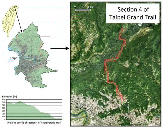 The survey was conducted along Section 4 of the Taipei Grand Trail (Figure 1). The Taipei Grand Trail is a network of scenic hiking routes that span the hills and mountains surrounding Taipei, Taiwan. The entire trail is about 92 km long and is divided into seven sections. Stretching a length of 12.92 km, Section 4 connects the Dahu Park Station of Taipei Metro and the legendary Yangmingshan National Park [].