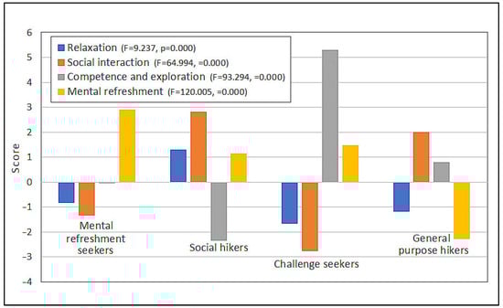 The factor scores were used to group the respondents into four clusters (i.e., segments) using K-means clustering (Figure 2). The results of ANOVA indicated that significant differences in motives were found among segments of hiking tourists (Figure 2).